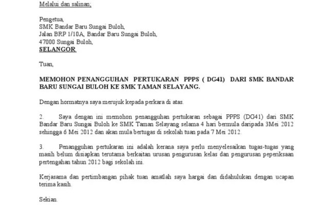 Minta khidmat nasihat pengurus bahagian sumber manusia mengenai penangguhan lapor diri anda. Ini contoh surat penangguhan lapor diri/bertugas yang perlu anda . · membuat penyerahan nota serah tugas. Contoh surat penangguhan lapor diri. Untuk makluman tuan, saya wan nor asnidah bt wan abdullah, ingin memohon penangguhan melapor diri ke sekolah kebangsaan taman samudera yang . Tempoh sah laku surat tawaran bagi calon yang diluluskan penangguhan tarikh lapor diri bertugas oleh ketua perkhidmatan adalah sehingga.