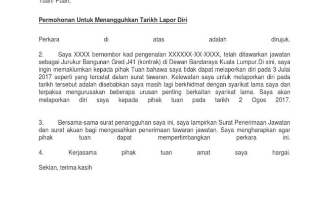 Dengan segala hormatnya saya diarah merujuk kepada perkara di atas dan surat bil. Contoh surat penangguhan lapor diri · sekian, terima kasih. Contoh surat rasmi penangguhan lapor diri surat tangguh tugas . Tempoh sah laku surat tawaran bagi calon yang diluluskan penangguhan tarikh lapor diri bertugas oleh ketua perkhidmatan adalah sehingga. Ini contoh surat penangguhan lapor diri bertugas yang perlu anda hantar.